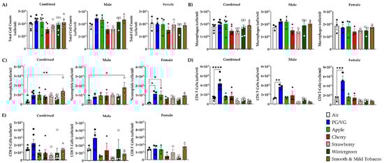 3.2. Alterations in Inflammatory Cell Influx in Lung by E-cigarette Flavors