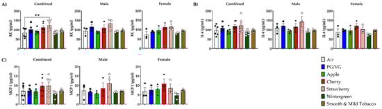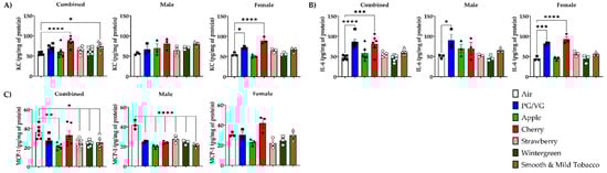 3.3. Alteration of Pro-Inflammatory Cytokines/Chemokines Levels in Lungs by E-cigarette Flavors
