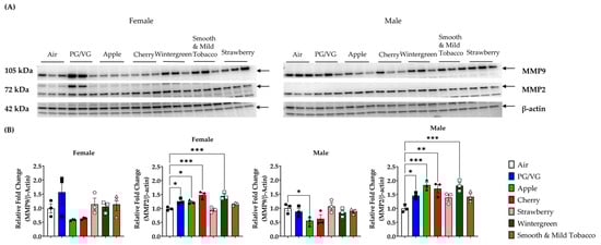 3.4. Alterations in Matrix Metalloproteinase Levels in Lungs by E-cigarette Flavors