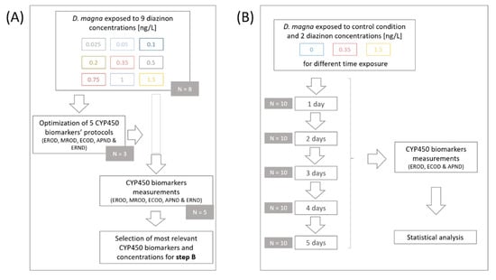 Experimental scheme of the first (A) and second (B) part of this study. (A) After optimization of five different CYP450 biomarkers’ protocols, measurements proceeded on daphnids exposed to nine diazinon concentrations. Most relevant CYP450 biomarkers and concentrations were selected (A) to be tested on daphnid neonates exposed for 1 to 5 days (B), as well as their basal activity. N corresponds to the number of replicates per condition.