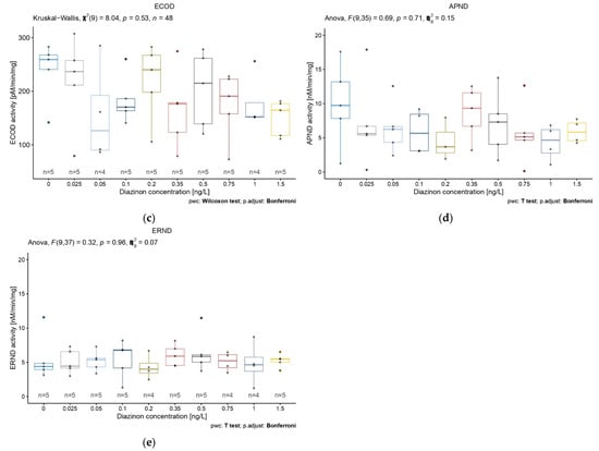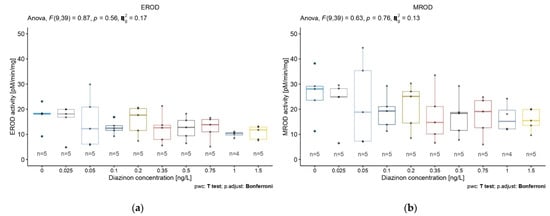 A decrease in APND activity was also observed according to diazinon concentration in two linear patterns (Figure 2d). ERND activity showed no trend according to diazinon concentration (Figure 2e). Based on these results and according to the different biomarkers’ relation to the CYP450 family, we selected EROD, ECOD, and APND as relevant biomarkers in our subsequent study.