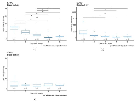 (a) EROD, (b) ECOD, and (c) APND basal activities for the first 5 days in D. magna. Significant statistical differences are indicated by * (p < 0.05), ** (p < 0.01), and *** (p < 0.001).