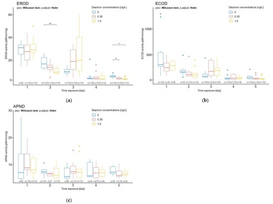 We aimed to compare the values of the enzymatic activities in response to three different diazinon concentrations and different exposure times. The effect of pesticide exposure time led to a significant decrease in EROD activity after 2 and 5 days in daphnid neonates (Figure 4a) (Kruskal–Wallis rank-sum test, X2 = 8.8335, df = 2, p = 0.01 and X2 = 10.065, df = 2, p = 0.007, respectively). After 2 days of exposure, the effect of the pesticide on EROD was detectable for the diazinon concentration of 1.5 ng/L (Figure 4a) (Wilcoxon rank-sum test, statistic = 88, p = 0.006). After 5 days of exposure, the lowest and highest concentrations of diazinon (0.35 ng/L and 1.5 ng/L) showed a significant effect on D. magna EROD activity (Figure 4a) (pairwise Wilcoxon rank-sum test, statistic = 84, p = 0.009 and statistic = 86, p = 0.005, statistic = 86, respectively).