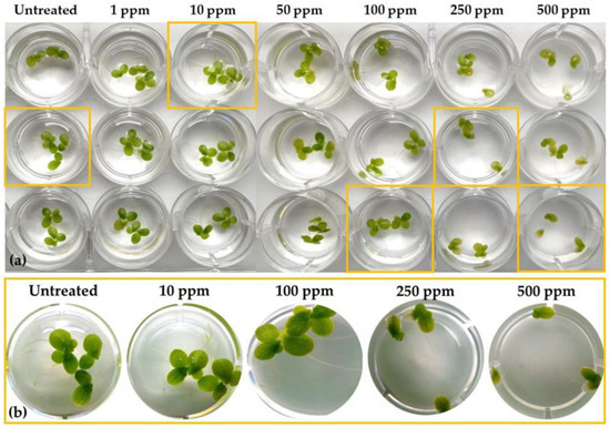 (a) Phenotypic observations of Lemna minor L. cultures 72 h post-treatment with the Bacillus sp. PTA13 lipopeptide extract. The extract was applied at the concentrations of 1, 10, 50, 100, 250, and 500 μg·mL−1, performing three biological replications per treatment. (b) Magnification of representative treatments enables the visualization of the effects of the lipopeptide extract on the plant.
