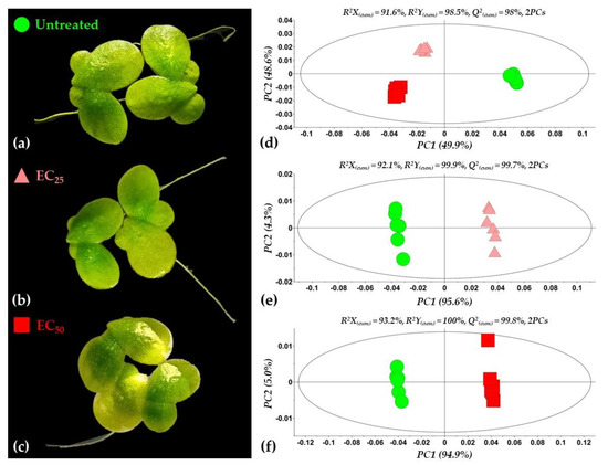 Effect of the Bacillus sp. PTA13 lipopeptide extract on the phenotypes of Lemna minor L. (a–c) and the corresponding GC/EI/MS metabolite profiles (d–f). The plants were exposed to concentrations equal to the EC25 (156 μg·mL−1) and EC50 (419 μg·mL−1) of the extract and analyses were performed 72 h following exposure. Both treatments resulted in a slight discoloration of the plants’ fronds (b,c). The metabolite differences between the untreated and the lipopeptide-treated plants were analyzed applying orthogonal partial least squares discriminant analysis (OPLS-DA). OPLS-DA PC1/PC2 score plots are displayed with 95% confidence interval. The ellipse represents the Hotelling’s T2. In total, fifteen biological replications of two plants each were performed per treatment, every three of which were pooled to provide a pooled sample. Five pooled and one quality control samples were analyzed per treatment [PC; principal component, Q2(cum); cumulative fraction of the total X’s variation that can be predicted, R2X and R2Y; fraction of the sum of squares of X’s and Y’s explained by the components, respectively].