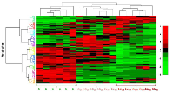 Effect of the Bacillus sp. PTA13 lipopeptide extract (EC25 = 156 μg·mL−1 and EC50 = 419 μg·mL−1) on the GC/EI/MS metabolite profiles of Lemna minor L. 72 h following treatments, visualized using two-dimensional cluster heat map. Hierarchical cluster analysis (HCA) was performed applying the Ward’s linkage method. The columns correspond to the treatments and the rows to metabolite features. Cells are color-coded according to the relative content of the metabolite features ranging from −3 (light green) to 3 (light red), designating low to high values, respectively. In total, fifteen biological replications of two plants each were performed per treatment, every three of which were pooled to provide a pooled sample. Five pooled samples and one quality control were analyzed per treatment (C; untreated).