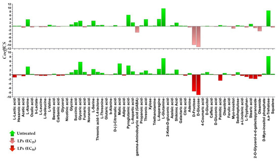 Coefficient plots displaying metabolite differences between the untreated and EC25 (156 μg·mL−1) (Upper plot) or EC50 (419 μg·mL−1) lipopeptide-treated (Lower plot) Lemna minor L. plants. Values of scaled and centered OPLS regression coefficients (CoeffCS) are displayed. High absolute values of CoeffCS correspond to annotated metabolites with the highest leverage on the observed discrimination. Positive values correspond to metabolites with increased levels in the untreated, whereas negative to those with increased levels in the lipopeptide-treated plants.