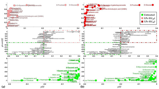 S-plots for the visualization of the OPLS-DA predictive component loadings for the study of the toxicity of the Bacillus sp. PTA13 lipopeptide extract on the metabolism of Lemna minor L. The plants were exposed to concentrations equal to the EC25 (156 μg·mL−1) (a) and EC50 (419 μg·mL−1) (b) of the extract and analyses were performed 72 h following exposure. Metabolites located far out on the wings of the S-plot correspond to biomarkers of lipopeptide toxicity. The S-plots are displayed in the middle panels and magnification of the upper right (upregulated metabolites) and lower left (downregulated metabolites) quadrants are displayed in the upper and lower panels, respectively.
