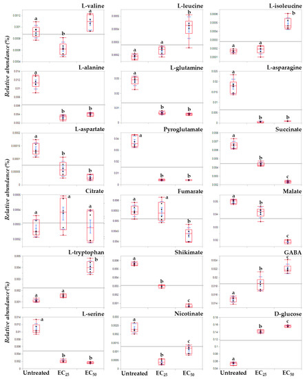 Box plots demonstrating the effect of the Bacillus sp. PTA13 lipopeptide extract on selected annotated Lemna minor L. metabolites 72 h following treatment with concentrations equal to the EC25 (156 μg·mL−1) and EC50 (419 μg·mL−1) values. In total, fifteen biological replications of two plants each were performed per treatment, every three of which were pooled to provide a pooled sample. Five pooled samples and one quality control sample were analyzed per treatment. The different letters above boxes indicate statical significance (Tukey HSD test, p > 95%).