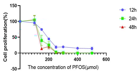 Cells were seeded into a 96-well plate with 10,000 cells in 100 μL of medium per well. After exposure to 100, 150, 200, 250, 300, 400 or 500 μM PFOS or an equal volume of DMSO for 12, 24, or 48 h, the Cell Counting Kit-8 (CCK-8) assay was performed to determine cell viability. The cells were incubated with 10 μL of CCK-8 (APE*BIO, Houston, TX, USA) for 2 h at 37 °C in the dark. Absorbance was measured at 450 nm using a microplate spectrophotometer. Cell viability was calculated as the ratio of the mean OD value among the cells treated differently in each group. IC50 values were calculated via dose–response curve fitting using GraphPad Prism v8.0.2 software (San Diego, CA, USA, 2018).