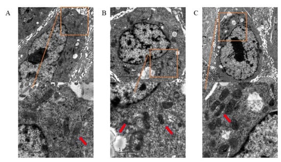 The four above-mentioned groups of cells were cultured in 60 mm plates, collected in a phosphate-buffered saline (PBS) solution, and fixed with 2% (v/v) paraformaldehyde (PFA, Beyotime, Shanghai, China) containing 2.5% (w/v) glutaraldehyde (Sigma, St. Louis, MO, USA) buffered in Hank’s modified salt solution (HMSS, Procell, Wuhan, China) at 4 °C for 4 h. The cells were further fixed in a 1% (w/v) OsO4 solution buffered by 0.1 M cacodylate (pH 7.2) at 4 °C for 2 h. Then, the cells were scraped off the plastic and dehydrated with dinethanol. Dehydration was conducted in propylene oxide. The specimens were embedded in an EPON medium and cut into 60–70 nm sections. The samples were analyzed and recorded with a JEOL 1200 electron microscope (JEOL Ltd., Tokyo, Japan).