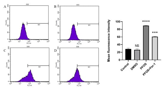 Detection of ROS production by flow cytometry. HUVECs were treated with DMSO, PFOS (180 μM), or Fer-1 (1 μM) and PFOS (180 μM). Then, the cells were collected and incubated with RPMI-1640 containing C11 BODIPY (10 μM) for 1 h. After incubation, the cells were washed with a serum-free cell culture medium and analyzed with flow cytometry. (A) Control group; (B) DMSO group; (C) PFOS group; (D) PFOS+ Fer-1 group. Each group was compared with the control group. NS, no significant difference; ***, p < 0.001; ****, p < 0.0001.