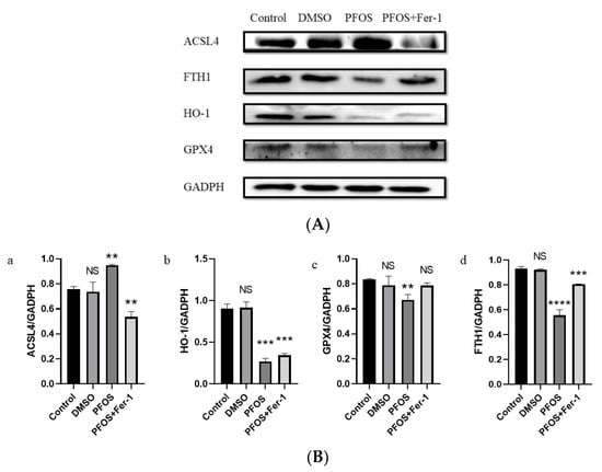 Western blot analysis demonstrated that PFOS could increase the expression of ACSL4 and decrease the expression of GPX4, HO-1, and FTH1. With the pre-treatment of Fer-1, the expression of ACSL4 was decreased (Figure 4(B-a) and the expression of GPX4 and FTH1 was increased (Figure 4(B-c,B-d)). There was a significant difference in the expression of HO-1 between the PFOS group and the PFOS and Fer-1 group (Figure 4(B-c)).