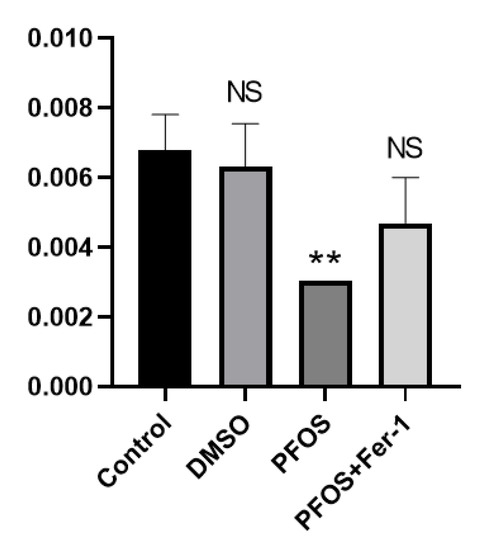 The production of NO in the cells exposed to PFOS was significantly decreased, and there was no significant difference in the production of NO between the cells exposed to PFOS and Fer-1 and the cells from the normal group (Figure 5). It was shown that Fer-1 could alleviate the symptoms of NO reduction caused by PFOS and improve the state of NO inactivation, which further indicates that PFOS can cause cell damage through ferroptosis.