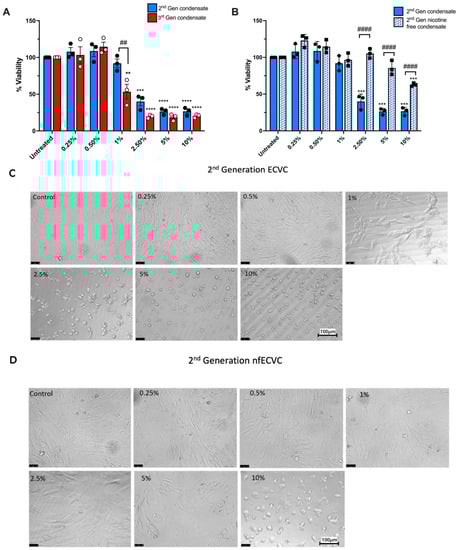 e-cigarette vapour condensate (ECVC) or nicotine-free e-cigarette vapour condensate (nfECVC) was collected from 2nd and 3rd generation e-cigarette devices, as previously described by Scott et al. []. Prior to use, e-Cigarette devices were cleaned and prepared with either 36 mg/mL nicotine flavourless liquid (Durasmoke® Unflavored e-Liquid (50% PG/50% VG Base), American e-liquid Store, (Wauwatosa, WI, USA) or nicotine-free flavourless liquid (Durasmoke® Unflavored eLiquid (50% PG/50% VG Base), American e-liquid Store, (Wauwatosa, WI, USA). Next, six tracheal suction taps (Unomedical, UK) were arranged in sequence and sealed with parafilm. EC devices were attached to the open end of tap 1, while tap 6 was connected to a vacuum tap by plastic tubing. Taps 2–6 were sealed inside 30 mL universal tubes with parafilm, to provide insulation and prevent cracking upon cooling. Next insulated taps were suspended in a dry ice/methanol bath and allowed to cool, tap 1 was kept outside the bath for observation of vapour production. The optimum puff duration of 3 s (previously determined by Scott et al.) was performed every 30 s until EC liquid was exhausted. Taps were then allowed to warm to room temperature, before centrifugation (2755× g, 5 min) to collect condensate. Condensate was pooled into a single 1.5 mL Eppendorf and stored at −40 °C for a maximum of 24 h before use.