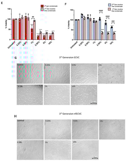 Osteoblast viability was quantified and cellular morphology observed following 24 h exposure to increasing doses of ECVC (0.25% to 10%), generated from either 2nd or 3rd generation devices. ECVC at 0.25% or 0.5%, generated from either 2nd or 3rd generation devices, had no significant effect on osteoblast viability (Figure 1A) or cellular morphology (Figure 1C,G). However, in contrast to the 2nd generation device, 1% ECVC generated by the 3rd generation device resulted in a significant reduction in osteoblast viability (46.6% ± 10.0% p = 0.002), compared to untreated control cells (Figure 1A). At ECVC concentrations of 2.5% and greater, condensate generated by either 2nd or 3rd generation devices significantly reduced osteoblast viability (p < 0.0001, Figure 1A). Furthermore, osteoblasts exposed to 2nd or 3rd generation ECVC at concentrations of 2.5% or greater, showed clear signs of altered cellular morphology, with loss of spindle cell shape (Figure 1C,G).