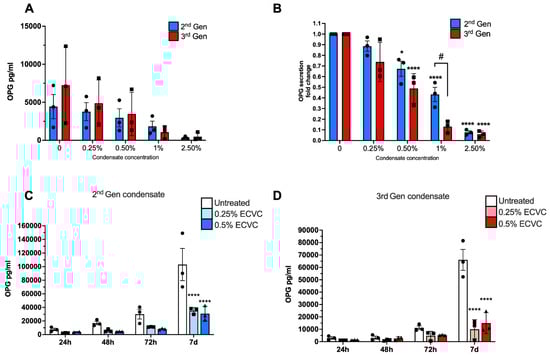 Furthermore, over 7 days, OPG secretion continued to increase significantly in untreated osteoblasts in a time dependent manner (Figure 2C). However, continuous exposure to either 0.25% or 0.5% ECVC for 7 days, significantly blunted OPG secretion at each timepoint for both 2nd and 3rd generation devices. By day 7, OPG secretion was approximately 2-fold or 4-fold less than that of untreated control cells for 2nd and 3rd generation devices, respectively, (p < 0.0001) (Figure 2C,D), whilst cellular viability and morphology remained unaffected (Figure 2E,F and Figure A1 in Appendix A).
