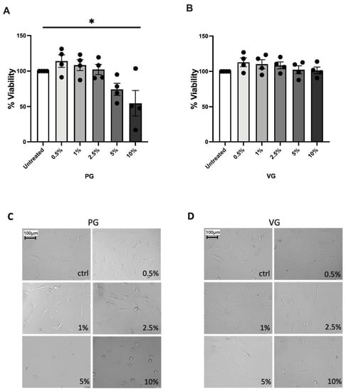 The effect of treatment with e-cigarette constituents on human osteoblast viability. (A,B) Effect of 24 h treatment of increasing dosages of PG and VG human primary osteoblast viability. (C,D) Representative images of human primary osteoblasts following 24 h exposure to increasing dosages of PG and VG, images captured at 20× magnification. n = 4 Patient replicates with 4 biological replicates performed per patient. * signifies p < 0.05 denoting a significant treatment effect by a Kruscal-Wallace test.