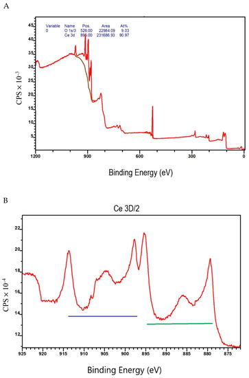 CeO2 XPS survey. (A) Full spectrum of CeO2 containing O s1 and Ce 3d; (B) detailed survey of Ce 3 d/2 region. CPS = counts per second.