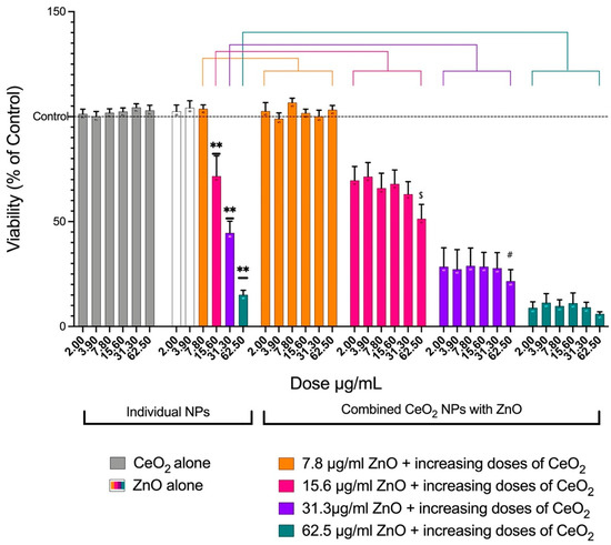 Viability of A549 cells after treatment with either individual NPs (two groups) or combined NPs (four groups). The plot shows the mean ± SEM of the percent AlamarBlue reduction in A549 cells (n = 5). For individual NPs, CeO2 alone showed no loss in viability, whereas ZnO showed a dose-dependent loss in viability. For the combined groups, combining each of the six doses of CeO2 with 7.8 μg/mL of ZnO did not affect the viability (orange). When each of the six doses of CeO2 was combined with 15.6 μg/mL of ZnO, the loss in viability at the highest concentration of CeO2 was more than that when 15.6 μg/mL of ZnO alone was used (pink). When 31.3 μg/mL of ZnO was added to the increasing doses of CeO2, 62.5 μg/mL of CeO2 caused the viability to be significantly lower than when 31.3 μg/mL of ZnO alone was used (purple). When 62.5 μg/mL of ZnO alone was compared with 62.5 μg/mL of ZnO plus 31.3 μg/mL or 62.5 μg/mL of CeO2, no significant difference was observed, but a loss in viability was notable. (**) Significantly different (p < 0.01) from the control. ($) Significantly different (p < 0.05) from 15.6 μg/mL of ZnO alone. (#) Significantly different (p < 0.05) from 31.3 μg/mL of ZnO alone.