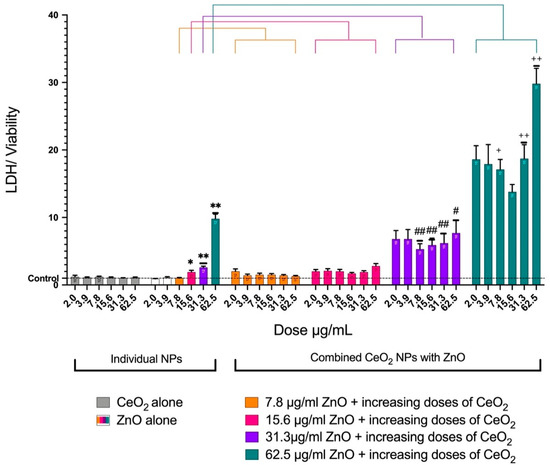 Release of lactate dehydrogenase from cells after treatment with either individual NPs (two groups) or combined NPs (for groups) for a 24-hour treatment. The graph represents the mean ± SEM of at least 10 treatments. The LDH was normalized for cell viability, LDH (% of control)/viability (% of control). The CeO2 group (gray) had no effect on cell viability. Increasing the doses of ZnO only caused an increase in LDH release in a dose-dependent manner. The first two groups of the combined NPs (orange and pink) did not show any increases in LDH leakage. When 31.3 μg/mL of ZnO was combined with CeO2, a significant elevation in LDH release was observed (purple). When 62.5 μg/mL of ZnO was combined with increasing doses of CeO2, the LDH release was significantly higher than when 62.5 μg/mL of ZnO alone was used (teal). (*) Significantly different (p < 0.05) from the control. (**) Significantly different (p < 0.01) from the control. (#) Significantly different (p < 0.05) from 31.3 μg/mL of ZnO alone. (##) Significantly different (p < 0.01) from 31.3 μg/mL of ZnO alone. (+) Significantly different (p < 0.05) from 62.5 μg/mL of ZnO alone. (++) Significantly different (p < 0.01) from 62.5 μg/mL of ZnO alone.