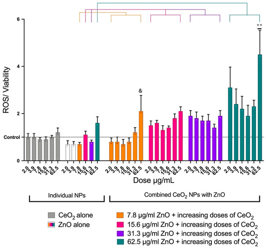 Generation of ROS after treating A549 cells with NPs for 24 h. The plot shows the mean ± SEM of ROS generation (n = 7) in A549 cells treated with ZnO, CeO2, or a mixture of both. ROS was normalized for cell viability, ROS (% of control)/viability (% of control). The CeO2 group (gray) had no effect on ROS. Increasing doses of ZnO only caused an increase in ROS generation. The mixture of both NPs caused more toxicity than ZnO alone. The presence of CeO2 augmented ZnO toxicity. (&) Significantly different (p < 0.05) from 7.8 μg/mL of ZnO alone. (++) Significantly different (p < 0.01) from 62.5 μg/mL of ZnO alone.