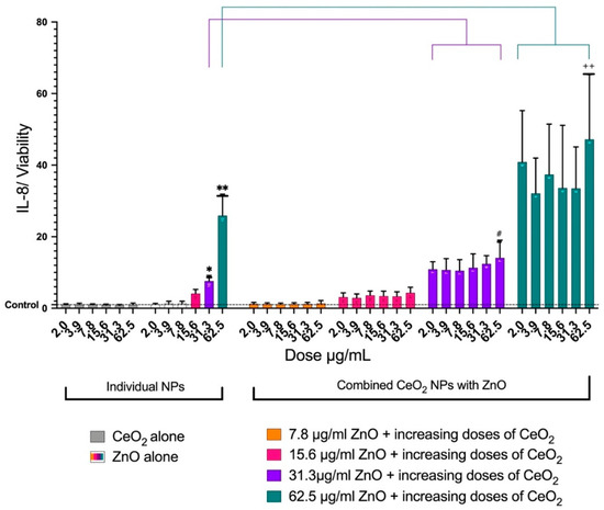 The effects of ZnO and CeO2 NPs in individual and mixture forms on the release of IL-8 from A549 cells. The plot shows the mean ± SEM of IL-8 release of six treatments of A549 with ZnO, CeO2, or mixtures of both. Levels of IL-8 were normalized for cell viability, IL-8 (% of control)/viability (% of control). The CeO2 group (gray) had no effect on IL-8 release. Increasing doses of ZnO only caused an increase in IL-8 release. Mixtures of both NPs caused more toxicity than ZnO alone. The presence of CeO2 augmented ZnO toxicity. (*) Significantly different (p < 0.05) from the control. (**) Significantly different (p < 0.01) from the control. (#) Significantly different (p < 0.05) from 31.3 μg/mL of ZnO alone. (++) Significantly different (p < 0.01) from 62.5 μg/mL of ZnO alone.