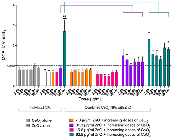 The effects of ZnO and CeO2 NPs in individual and mixture forms on the release of MCP-1 from A549 cells. The graph presents the mean ± SEM of MCP-1 release from six treatments of A549 cells with ZnO, CeO2, or mixtures of both. Levels of MCP-1 were normalized for cell viability, MCP-1 (% of control)/viability (% of control). CeO2 did not cause an elevation in MCP-1 release (gray). Increasing the doses of ZnO affected MCP-1 release only at 62.5 μg/mL. The mixture of 62.5 μg/mL of ZnO and 62.5 μg/mL of CeO2 caused a significant reduction in MCP-1 (teal). (**) Significantly different (p < 0.01) from the control. (+) Significantly different (p < 0.05) from 62.5 μg/mL of ZnO alone.