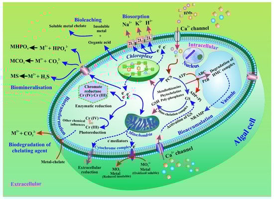 Understanding how heavy metal ions interact with the cell surfaces of microalgae is difficult due to the complexity of the cell surface. A number of chemical and physical interactions have been documented. Chelation and complexation of HMMs with active groups in the cell wall are the main mechanisms involved. Ions, such as calcium, sodium, magnesium, and potassium, can be reversibly replaced in solution by other harmful HMMs via an ion-exchange mechanism on the surface of microalgae cells []. Physical factors, such as Van der Waals and electrostatic interactions, can influence the physical adsorption mechanism of the metal-binding onto the cell surface. In addition, microprecipitation is a process related to both active and passive metal absorption pathways [].