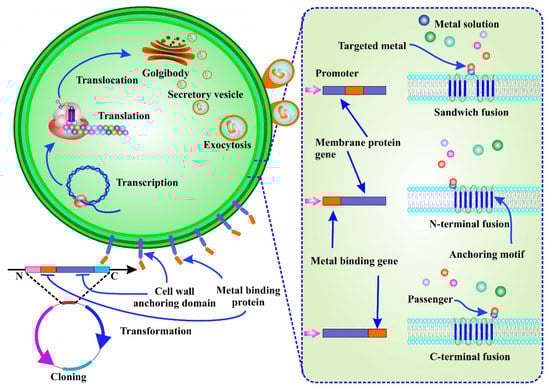 Although adsorption-based techniques have significant potential for HMM absorption, the lack of selectivity for targeted metal absorption from heterogeneous metal ion solutions is the main drawback associated with this process []. By changing the metallosorption characteristics of cell surfaces to improve adsorption selectivity for target metal species, the bioengineering of living microorganisms has enabled the development of novel biosorbents []. Cell surface engineering, also known as cell surface display, is a molecular approach that involves the expression of functional proteins of interest (passengers) on the cell surface by translational fusion to an anchor protein. As a result, the passenger protein is able to cross the cell membrane []. Artificial proteins with new functions, such as strong metal-binding affinity, can be employed to remove HMMs using genetic and protein engineering (Figure 3) [].