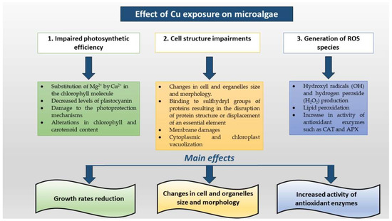 In Figure 1, we illustrated the principal effects of Cu high concentrations on microalgal cells.
