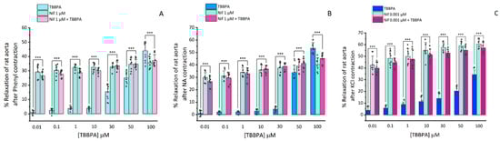 | Contraction with Phenylephrine (1 μM) | TBBPA (Ct1) | VS | Nif 1 μM + TBBPA | *** | *** | *** | *** | *** | *** | *** |