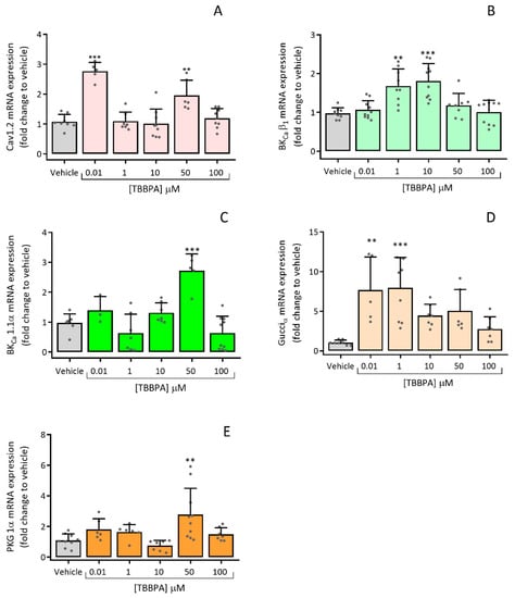 3.2.3. Effects of TBBPA on the Expression of Cav1.2, BKCa β1, BKCa 1.1α, Gucciα and PRKG 1α