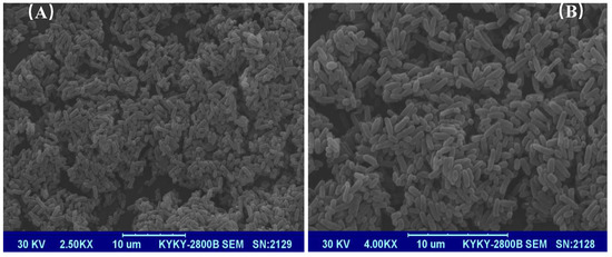 SEM images of strain Acinetobacter baumannii DP-2 at (A) 2.5KX and (B) 4.0KX.