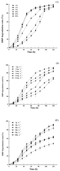 The effects of inoculation amount on the DBP degradation rates of DP-2 were investigated at an initial DBP concentration of 10 mg·L−1. The results indicate that DBP degradation rates greater than 90% were achieved in all treatments after 5 days’ cultivation when the inoculation amount ranged from 1% to 20% (Figure 3A). It showed no significant differences when the inoculation amounts were 10%, 15%, and 20%. However, DP-2 showed relatively lower DBP degradation rates when the inoculation amount was lower than 5%. Thus, to achieve higher DBP degradation rates, the inoculation amount of DP-2 should be kept at least 10% during the cultivation process.
