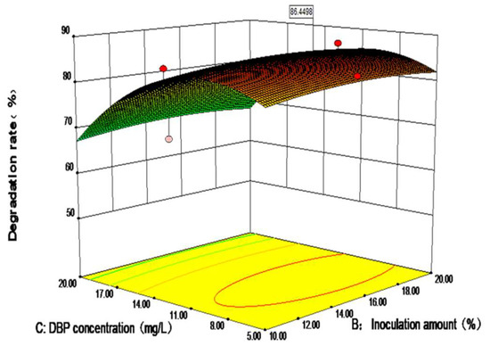 The parameters, including inoculation amount, DBP concentration, and NaCl concentration, were selected as the variables to optimize the degradation performance of DP-2 via a Box–Behnken response surface experiment. The results of the response surface test are summarized in Table 3. The corresponding quadratic equation model is as follows: