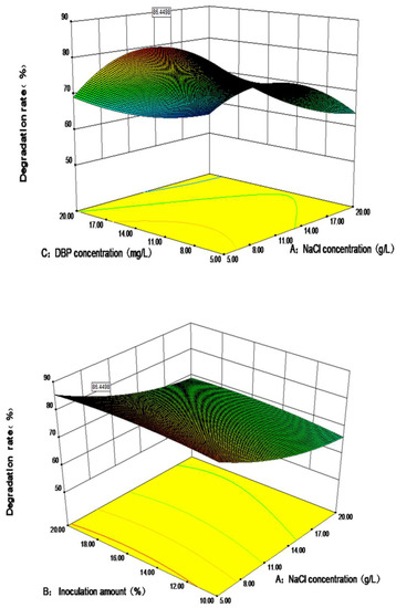 where A is the NaCl concentration (g·L−1), B is the inoculation amount (%), and C is the initial DBP concentration (mg·L−1).