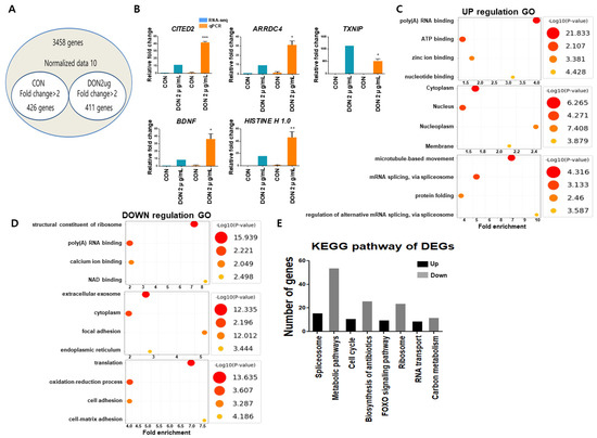 Gene-expression profiling in DON-treated porcine intestinal epithelial cells. (A) Venn diagram of genes up or downregulated 2-folds compared with control after DON treatment. (B) The TOP5 of upregulated differentially expressed genes (DEGs) data were validated by real-time quantitative PCR (n = 3). (C) Gene Ontology enrichment analysis of upregulated genes (p < 0.01). (D) Gene Ontology enrichment analysis of downregulated genes (p < 0.01). (E) Kyoto Encyclopedia of Genes and Genomes pathway classification enrichment analysis of differentially expressed genes (p < 0.05). * p < 0.05, ** p < 0.01, *** p < 0.001.