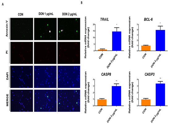 To determine whether DON induces apoptosis in IPECs, we performed double staining with Annexin-V and propidium iodide at various concentrations of DON (1 μg/mL, 2 μg/mL) (Figure 3A). Apoptosis was significantly increased in cells treated with DON 1, 2 μg/mL compared to untreated cells. Additionally, we confirmed the mRNA-expression level of apoptosis-related genes such as TRAIL, BCL-6, CASP3, and CASP8. These were significantly increased when compared to the untreated control (Figure 3B).