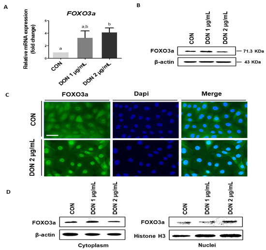 We used quantitative real-time PCR, Western blotting, and immunocytochemistry to determine the expression of FOXO3a. At 1 ug/mL DON, the level of FOXO3a mRNA expression was not significantly different from the control. However, when DON 2 μg/mL was used, the level of FOXO3a mRNA expression was significantly increased compared to the control (Figure 4A). There was no difference in the level of FOXO3a protein expression (Figure 4B). Immunocytochemistry analysis revealed that DON induces FOXO3a nuclear translocation (Figure 4C). Additionally, at a DON 2 μg/mL concentration, FOXO3a expression was significantly decreased in the cytoplasm and significantly increased in the nucleus (Figure 4D). Following these findings, subsequent experiments were conducted at a DON concentration of 2 μg/mL.