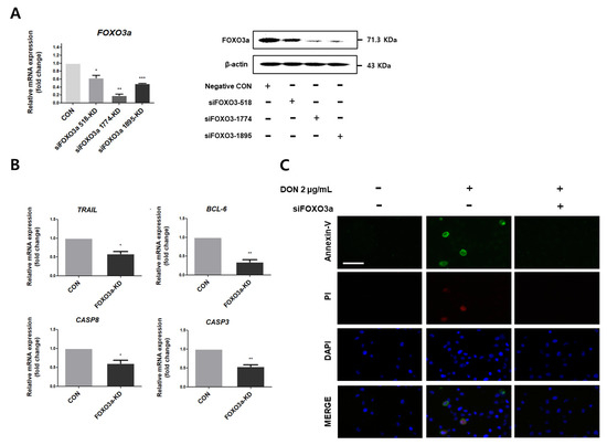 Knockdown of FOXO3a attenuates apoptosis. (A) After siFOXO3a treatment, levels of FOXO3a protein expression and mRNA expression. (B) After DON and siFOXO3a treatment, mRNA-expression level of apoptosis-related genes (TRAIL, BCL-6, CASP3, and CASP8) were compared with the negative control. (C) Apoptosis analysis was performed through single-cell staining using the Annexin-V (green) and propidium (red) iodide. Nuclei were stained with 4′,6-diamidino-2-phenylindole (DAPI; blue). (Scale bar means 40 μm). * p < 0.05, ** p < 0.01, *** p < 0.001.