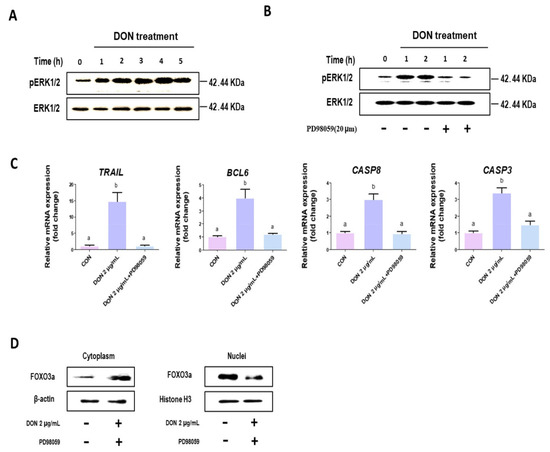 Doexynivalenol increased ERK1/2 phosphorylation, and inhibition of ERK1/2 suppresses a translocation of FOXO3a. (A) ERK1/2 phosphorylation level in IPEC-J2 cells after DON treatment in concentrations of 2 μg/mL for (1 h, 2 h, 3 h, 4 h, 5 h). (B) Level of phosphorylation (0 h, 1 h, and 2 h) of ERK1/2 by PD98059 in cells treated with DON at a concentration of 2 μg/mL. (C) The mRNA-expression levels of apoptosis-related genes (TRAIL, BCL-6, CASP3, and CASP8) on PD98059-treated IPEC-J2. (D) Western blotting analysis show inhibition of FOXO3a translocate after PD98059 treatment. Lowercase letters (a and b) mean significant differences between groups based on Duncan’s multi-range test.