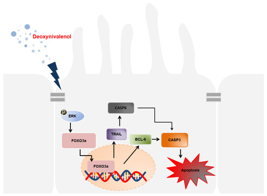 Schematic illustrating of current working hypothesis toward DON-mediated apoptosis via the FOXO3a-signaling pathway. DON-induced translocation of FOXO3a to nucleus, which regulated TRAIL and BCL-6 expression and lead to activation of CAPS8 and CASP3. Finally, CASP8- and CASP3-induced apoptosis on porcine intestinal epithelial cells via the ERK1/2-signaling pathway.