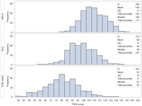 Frequency distribution of FSIQ score by cohort. Different WISC editions were used among the cohorts: the 3rd in the PCB cohort, the 4th in the NAC-II, and the 5th in the OCC. Abbreviations: FSIQ, Full-Scale Intelligence Quotient; NAC-II, Northern Adriatic Cohort; OCC, Odense Child Cohort; SD, standard deviation.