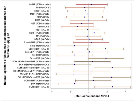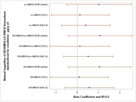 The relations between the FSIQ score and each phthalate/HEXAMOLL® DINCH biomarker were explored, applying simple and multiple linear regressions adjusted for the highest education level of the household of the child, child’s sex, and BMI z-score. β and 95% CI of each multiple linear regression were presented in the forest plot grouped by phthalates and HEXAMOLL® DINCH (in the Supplementary Material; Figures S2–S4 show the forest plots grouped by cohort). Separate models were applied for each biomarker in each cohort. Phthalates and HEXAMOLL® DINCH biomarker concentrations were natural logarithm transformed because of their skewed distribution and standardized according to child urine’s creatinine levels (µg/g creatinine) to account for urinary dilution. As sensitivity analyses, simple and multiple regression models were performed considering the natural logarithm transformation of phthalates and HEXAMOLL® DINCH biomarker concentrations without the creatinine standardization and the natural logarithm transformation of the biomarkers 5OH-MEHP+5cx-MEPP, 5OH-MEHP+5oxo-MEHP, and OH-MINCH+cx-MINCH expressed in molar unit standardized for creatinine.