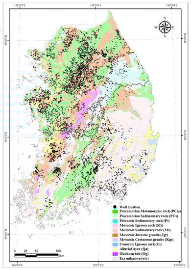 - Hwang, J. Geological Review on the Distribution and Source of Uraniferous Groundwater in South Korea. J. Eng. Geo. 2018, 28, 593–603. [Google Scholar] [CrossRef]