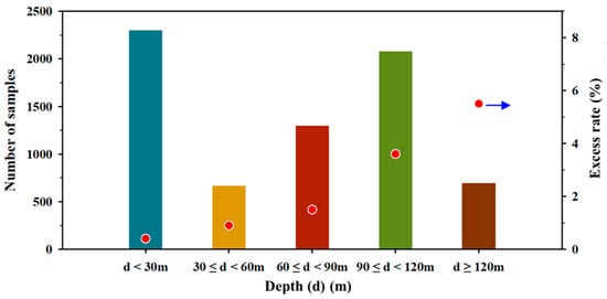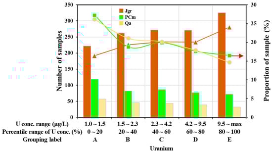 The number and proportion of samples belonging to each group categorized based on the range of uranium concentrations as given in Table 5. The results are correspondent to only three types of geology showing relatively higher excess rates, such as the Jurassic granite (Jgr), the Precambrian metamorphic rock (PCm), and the Quaternary alluvium (Qa). Data from Table 2 and Table 5. The red arrow designates the value of the y-axis on the right side.