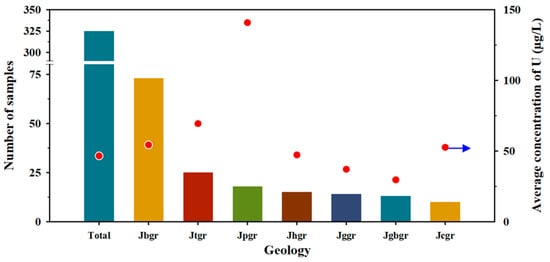 The number of samples and the average concentrations of uranium for the E group according to the detailed rock types of the Jurassic granite (Jgr) showing the highest excess rates, such as the Jurassic biotite granite (Jbgr), the Jurassic two-mica granite (Jtgr), the Jurassic porphyritic granite (Jpgr), the Jurassic hornblende–biotite granite (Jhgr), the Jurassic gneissoid hornblende–biotite granite (Jggr), the Jurassic garnet-bearing granite (Jgbgr), and the Jurassic coarse-grained granite (Jcgr). Data from Table 6. The red dots and blue arrow correspond to the value of the y-axis on the right side.