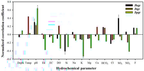 The results of the normalized correlation analyses for three detailed rock types of the Jurassic granite (Jgr), such as the Jurassic biotite granite (Jbgr), the Jurassic two-mica granite (Jtgr), and the Jurassic porphyritic granite (Jpgr), to evaluate the relationship between uranium concentration and hydrochemical parameters. Data from Table 6. * Significance (p-value) ≤ 0.05, ** Significance (p-value) ≤ 0.01.