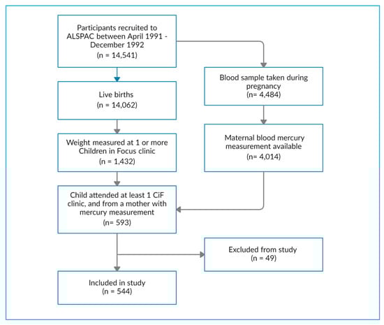 There were 593 children who (a) had at least one weight measurement between the age of 4 to 61 months from a Children in Focus clinic and (b) were born to mothers with a blood mercury measurement. After excluding very preterm births and multiple pregnancies, 544 children were included in the study (Figure 1).